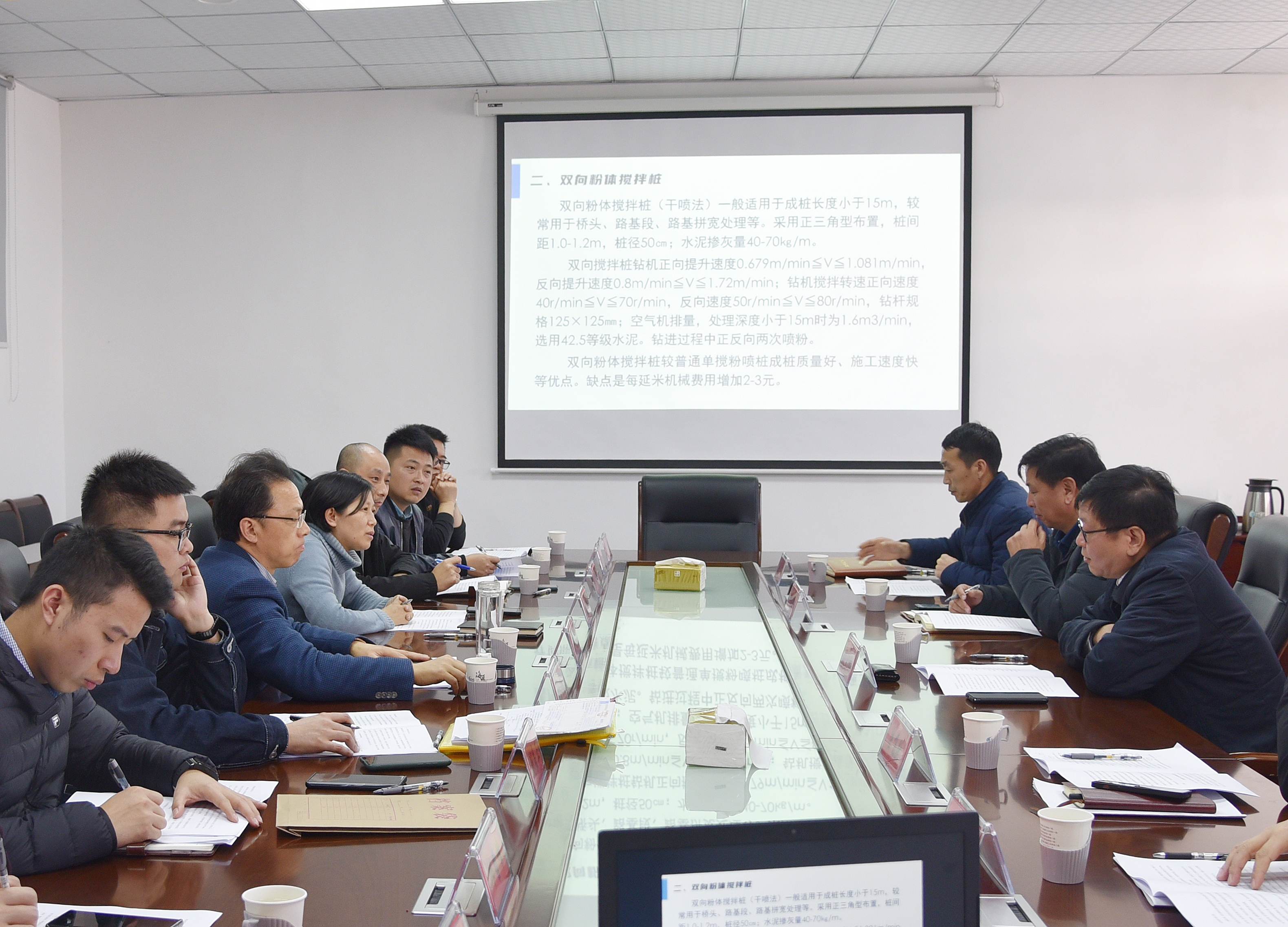 座谈会上,调研组听取了海建公司基本情况、主要工程业绩,以及本地施工项目中采用的软土地基处治方案。