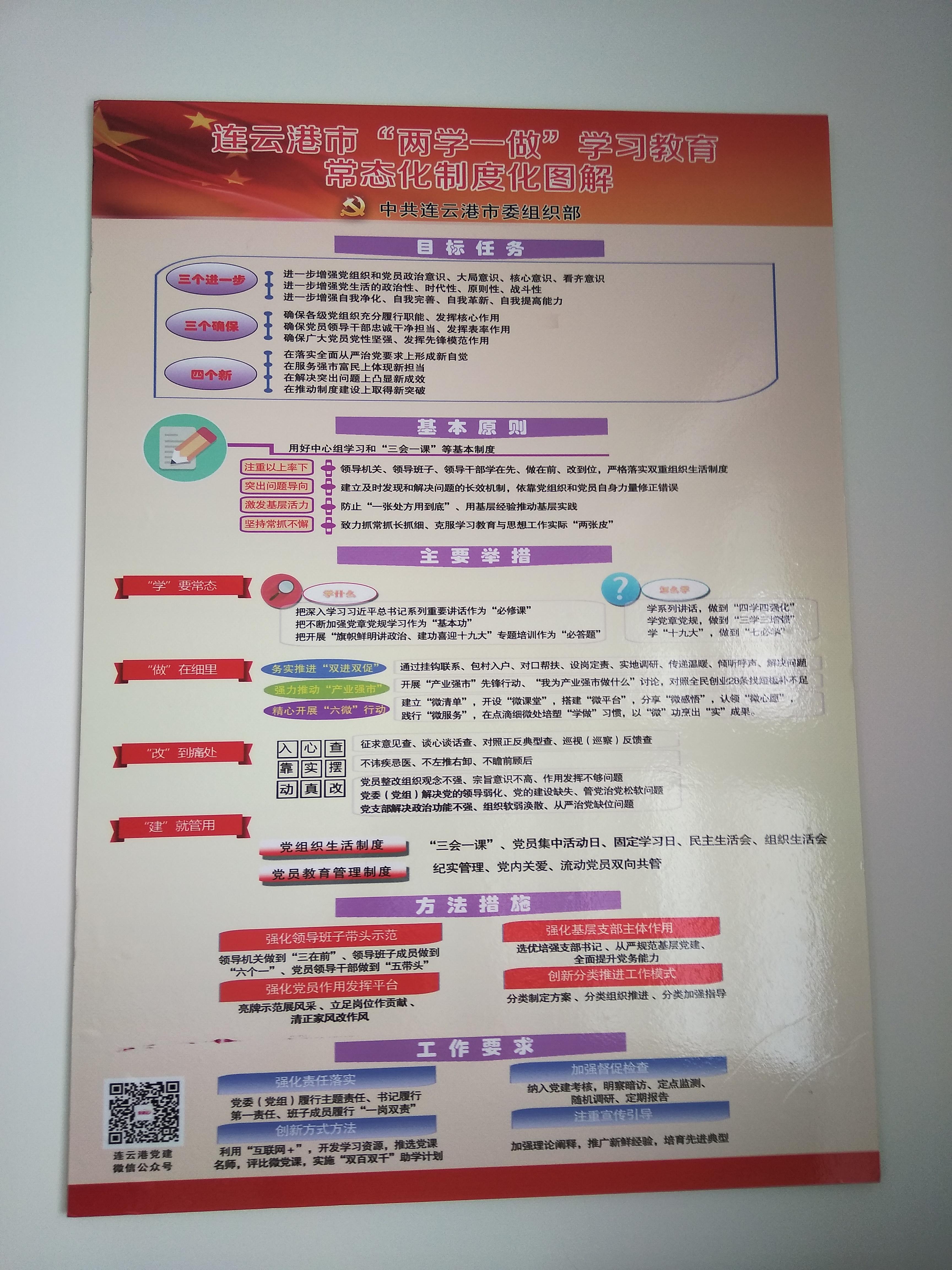 为确保“两学一做”学习教育活动常态化,保证各党支部明确学习教育怎么抓、党员怎么学、问题怎么改等问题,根据交通控股完美app最新版下载,完美(中国)党委要求,江苏海通通仁分公司党总支在党员活动室张贴连云港市“两学一做”学习教育常态化制度化图解,挂图围绕学习教育活动,逐一细化分解,确定了“两学一做”活动的目标任务、基本原则、主要举措、方法措施、工作要求等五个大类25小项重点内容,让每个党支部、每位党员做到心中有数,都有一本“明白账”,切实把学习教育各项工作做细做实做到位,确保学习教育深入人心,形成常态机制。
