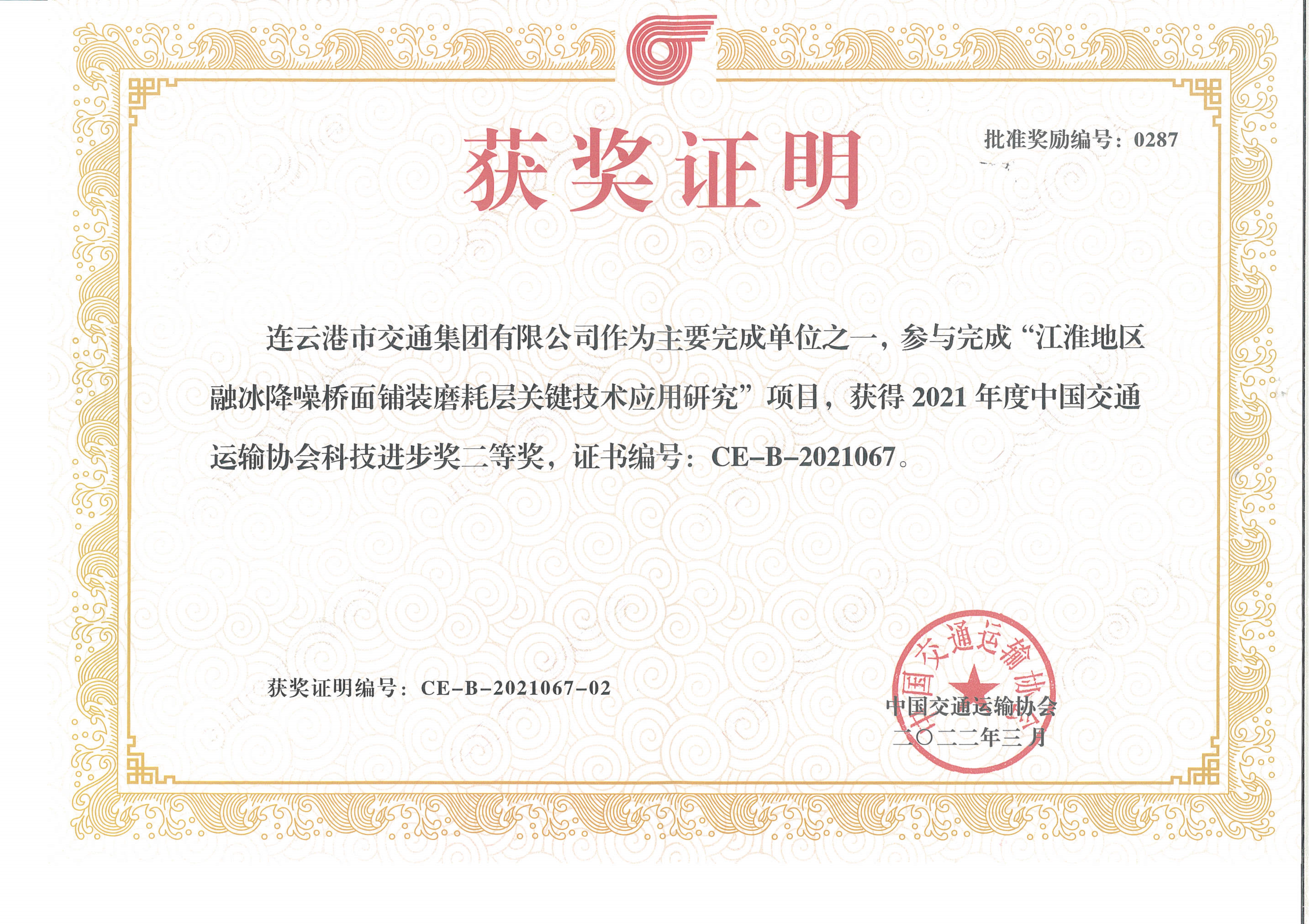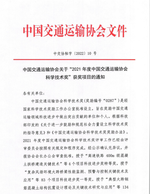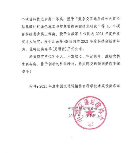 近日,中国交通运输协会发布了“2021年度中国交通运输协会科学技术奖”获奖项目名单,交通完美app最新版下载,完美(中国)联合苏交科完美app最新版下载,完美(中国)等单位申报的“江淮地区融冰降噪桥面铺装磨耗层关键技术应用研究”项目荣获中国交通运输协会科技进步奖二等奖。