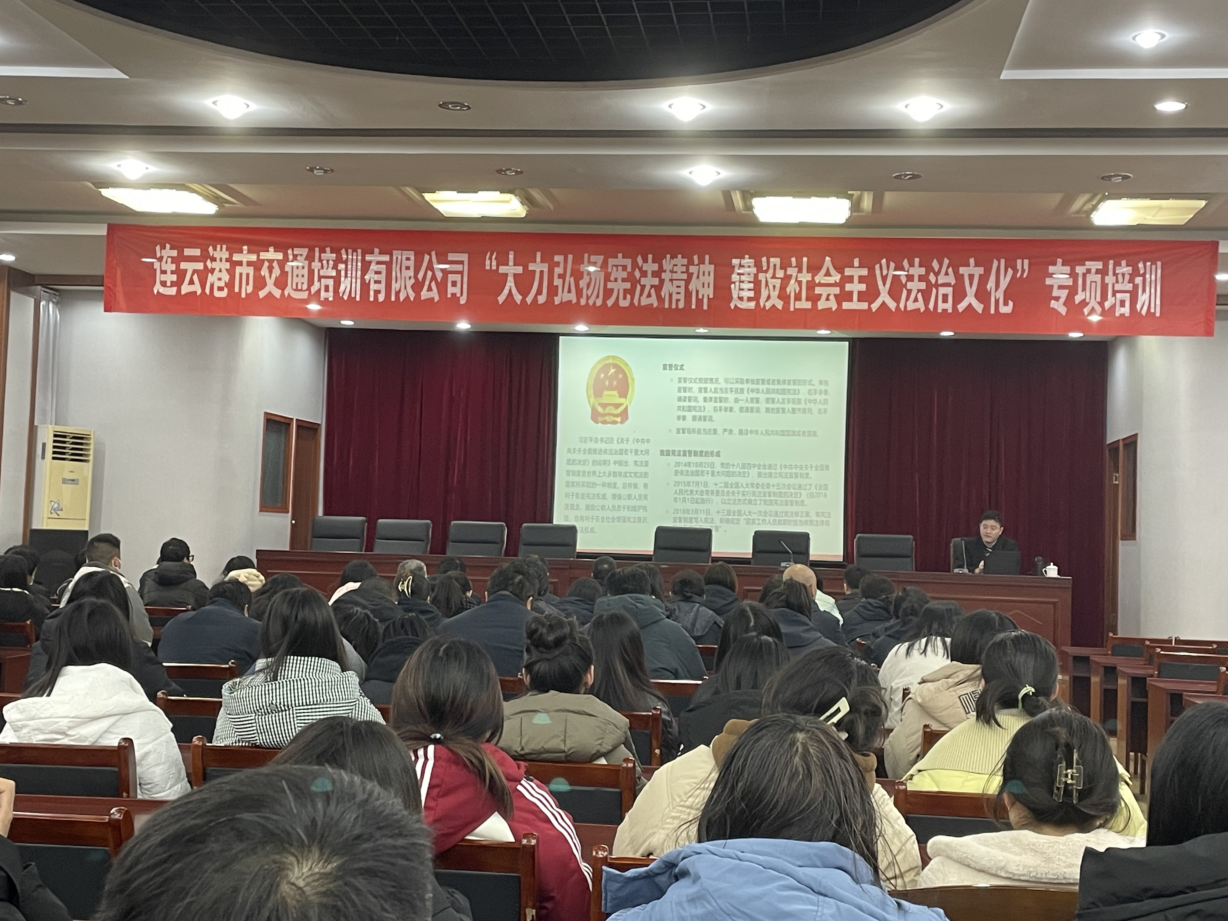 为推动公司上下树立宪法意识,增强遵法守法的法治观念,营造浓厚的学法守法氛围,积极开展宪法宣传周系列活动。12月5日,公司组织近百名干部职工、学生代表开展宪法知识讲座,由江苏法德东恒(连云港)律师事务所骆律师主讲。