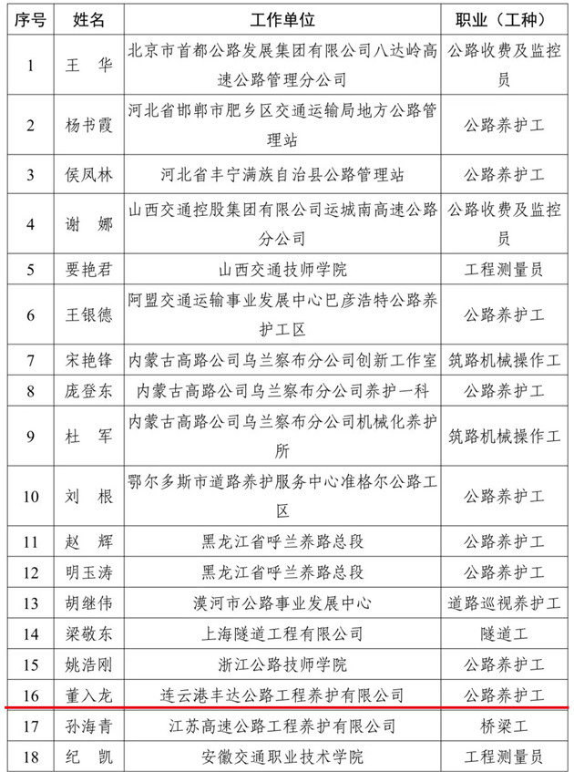 近日,交通运输部公布2021年度全国交通技术能手评审结果,连云港市交通控股完美app最新版下载,完美(中国)丰达养护公司公路养护工董入龙同志荣誉“全国交通技术能手”称号。据悉,全国仅有245名同志获此荣誉。