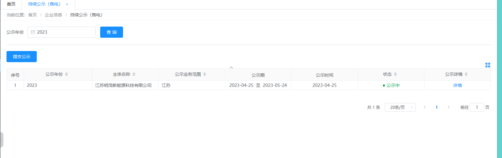 本次公示工作主要将售电公司每年自主公开满足入市的售电公司主体数据写入到年度公示表中,供售电公司年度公示数据展示,公示数据包括企业信息,股权信息,从业人员信息,资产信息,场所信息,电力市场技术支持系统信息,信用信息附件等数据。