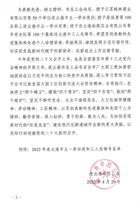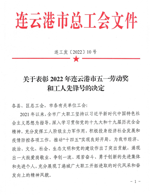 近日,石梁河生态修复一期工程建设处被连云港市总工会授予“2022年度连云港市工人先锋号”荣誉称号。