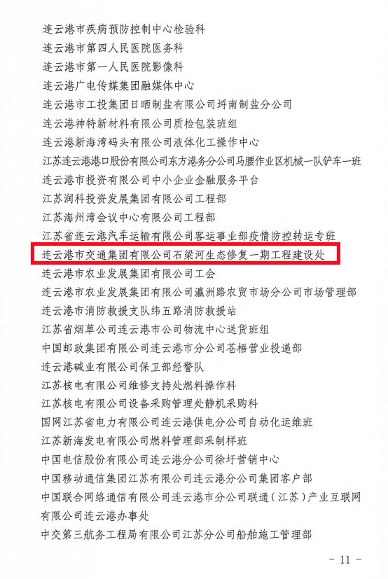 石梁河生态修复一期工程建设处获连云港市“工人先锋号”荣誉称号