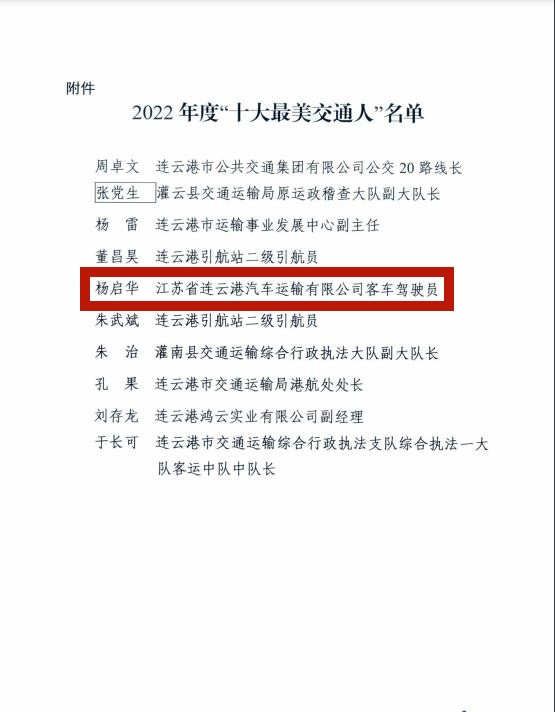 为深入贯彻落实中央和省市培育践行社会主义核心价值观系列部署要求,擦亮“美·德照亮港城”品牌,弘扬传递社会正能量,培育和弘扬新时代交通精神,2022年7月至9月,市交通运输局组织开展了2022年度“十大最美交通人”评选活动。经过宣传发动、推荐申报、初评筛选、网络投票、专家评审等环节,汽车公司客车驾驶员杨启华勇于担当、无私奉献,为推动交通运输高质量发展做出了积极贡献,荣获连云港市2022年度“十大最美交通人”。