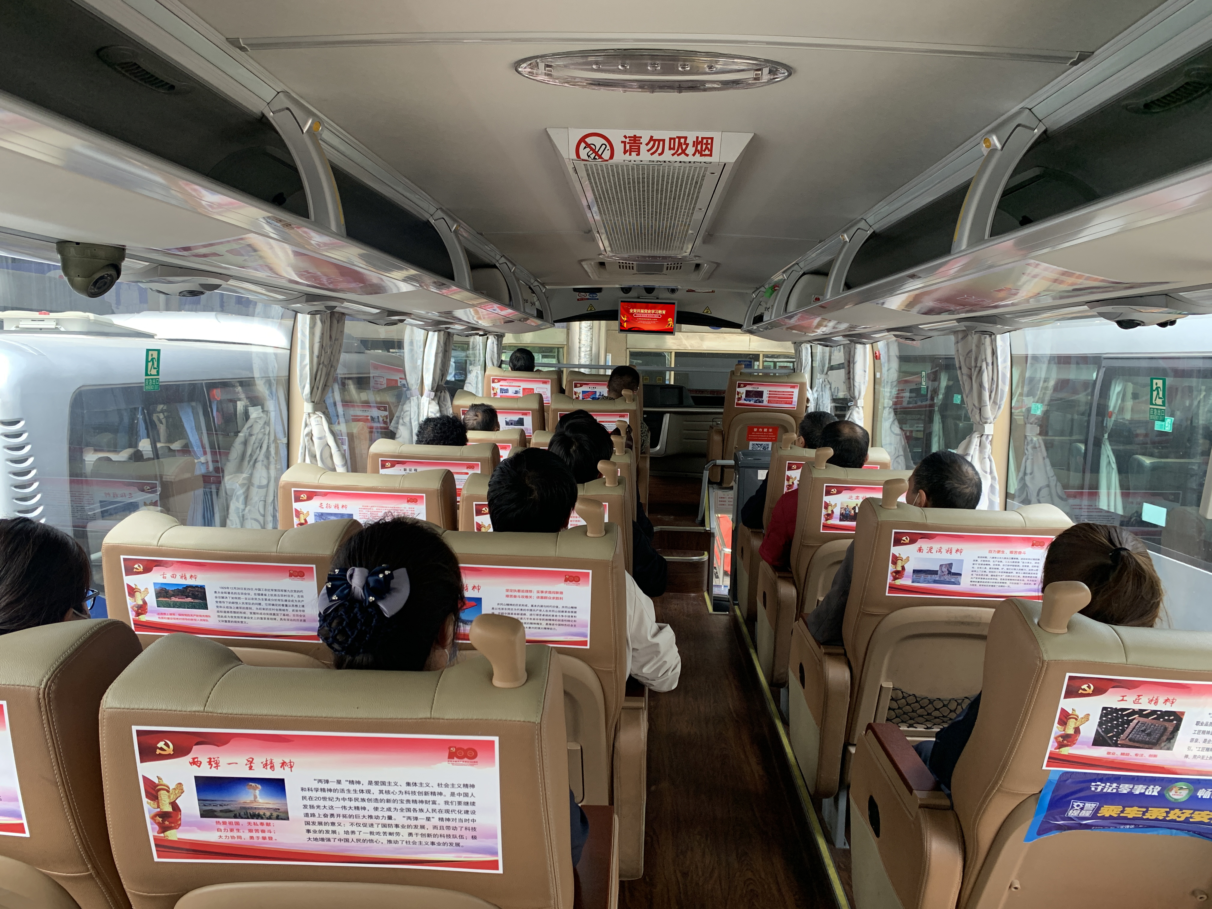 车厢内广告展板、座椅背板、行李架等设施上张贴着从中国共产党诞生到新中国成立的重大活动、重大战役,党的一大到十九大的光辉历程,从红船精神、井冈山精神到延安精神……LED显示屏上播放着党史教育片,精彩地展现了在共产党的领导下,祖国的日益强大和人民生活的日益幸福,让市民群众在乘坐长途客车的途中,潜移默化地学党史,汲取成长动力、传承红色基因,得到旅客们的追捧。