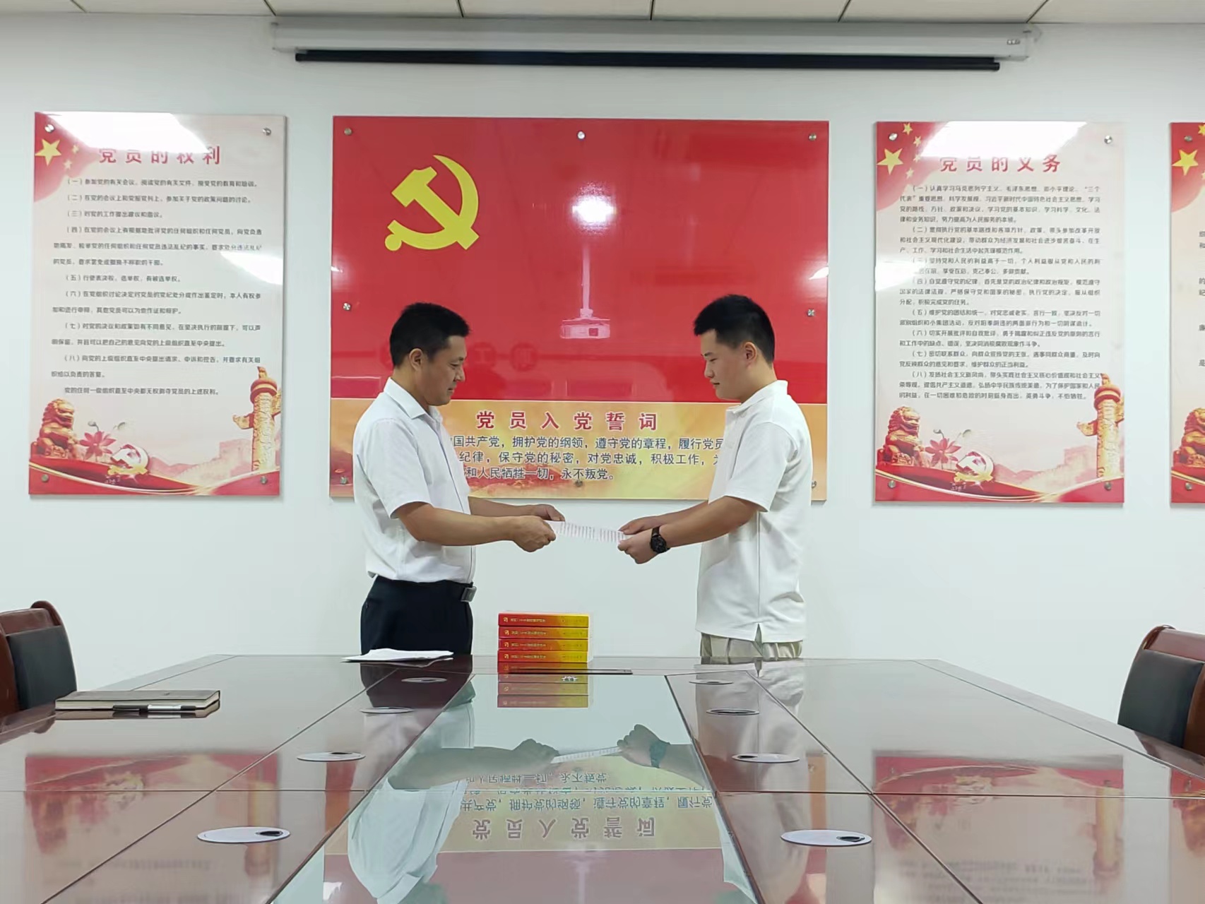 “起来,饥寒交迫的奴隶……”伴随着雄壮有力的《国际歌》,新入职的4名青年员工向党组织递交了入党申请书,通过谈入党动机和对党的认识,向党组织表达了入党愿望和决心。每一封字迹工整的入党申请书,无一例外表达了青年们渴望入党的迫切心情。