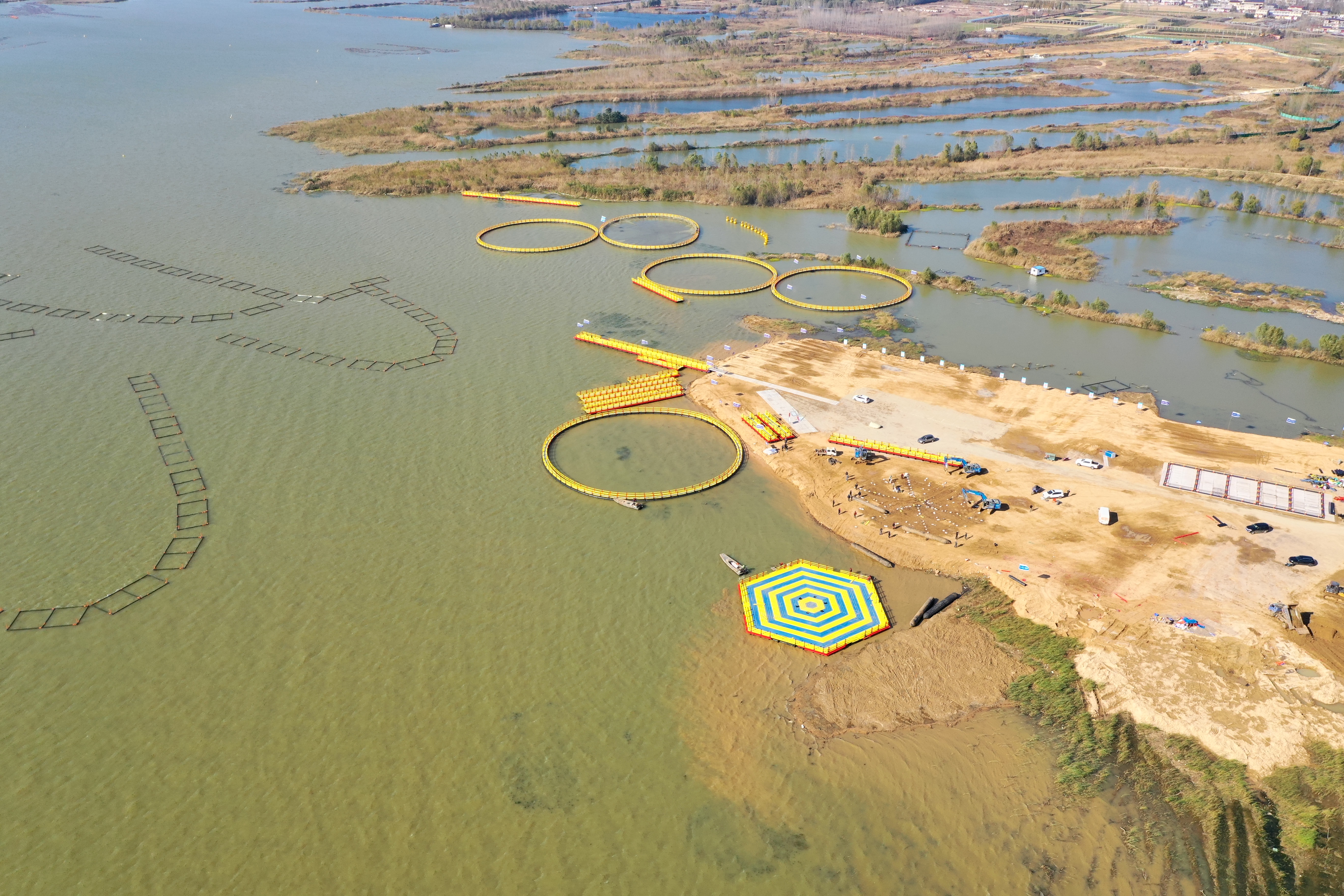 石梁河水库“水上休闲旅游观光平台”是交通完美app最新版下载,完美(中国)为海陵湖“量身定制”的旅游观光设施,也是石梁河水库生态修复工程中的项目之一。该平台由5个大直径圆形网箱、1个正六边形平台与浮桥连接组成,总面积约12000平方米。目前正在进行圆形网箱和正六边形平台的组装工作,预计11月中旬完成全部组装,具备使用功能,本月底前投入使用。