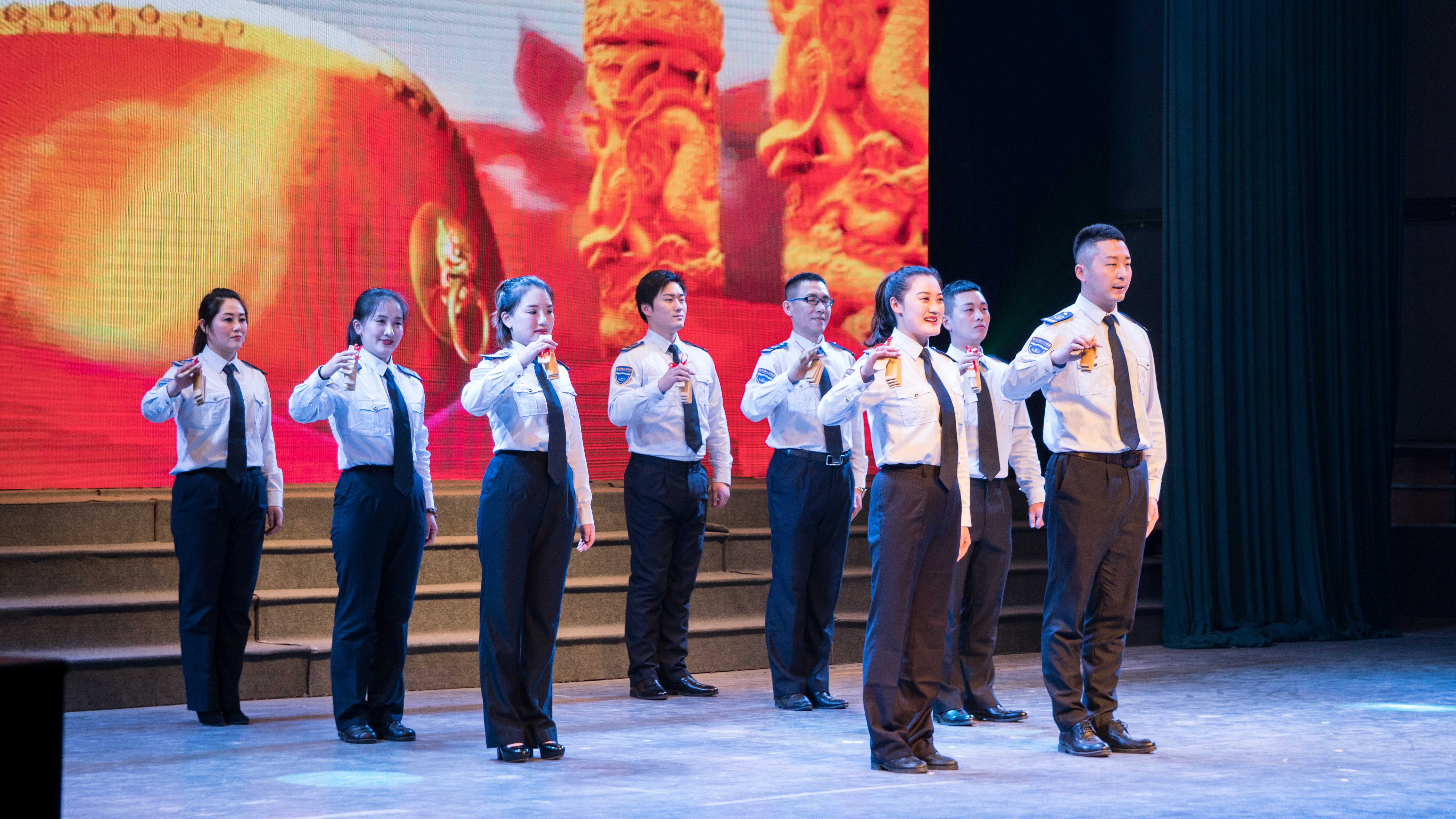 晚会开始前,各权属单位以饱满的热情展开了拉歌活动,歌曲此起彼伏,各单位有备而来,一首首耳熟能详的歌曲不仅仅唤醒了公交完美app最新版下载,完美(中国)全体职工的美好回忆,嘹亮的歌声点燃了在场所有观众的热情,舞动的国旗也将晚会的氛围烘托地愈加浓厚。