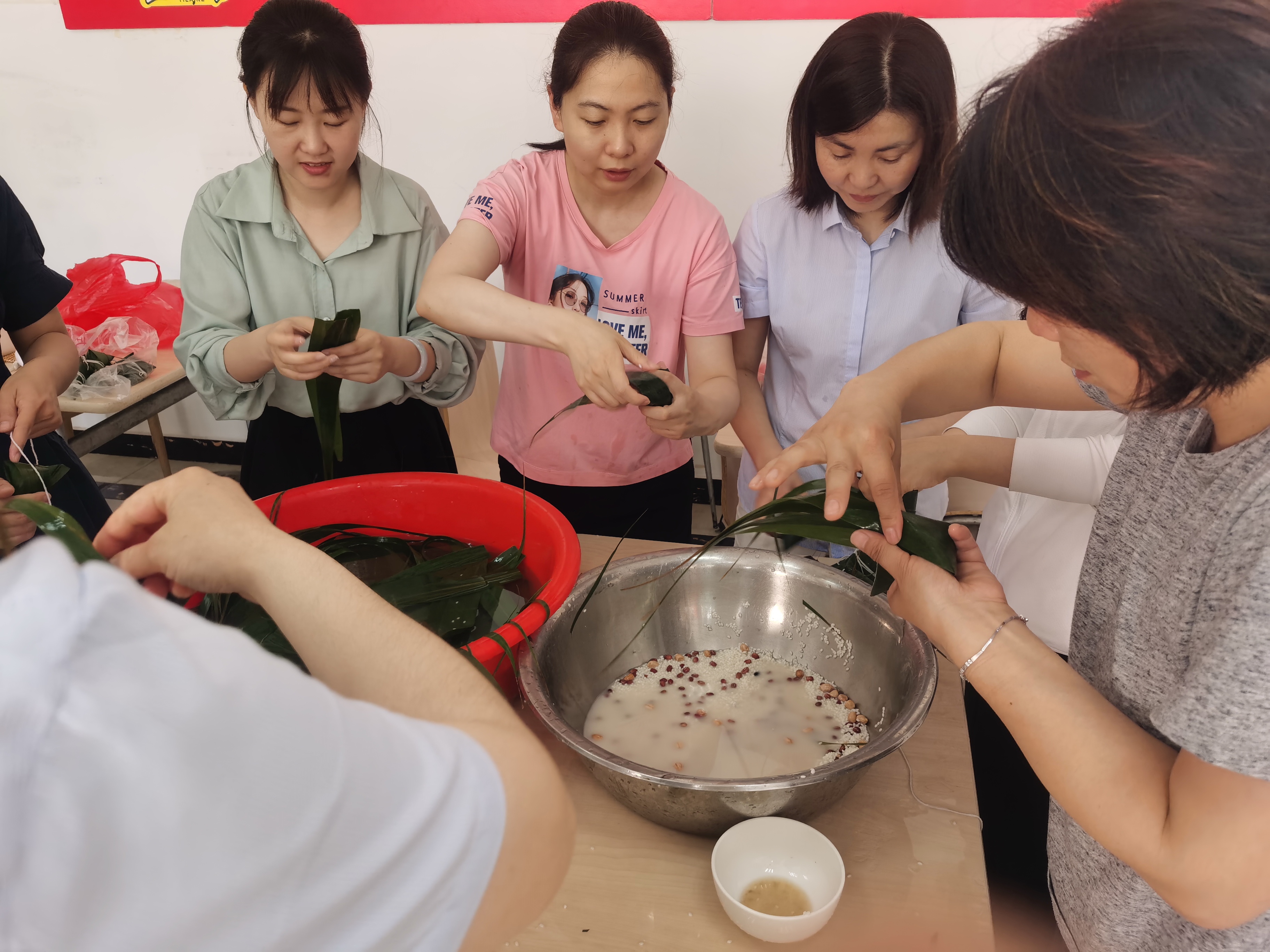 下午2点,参加活动的机关及各权属单位共20余名职工到达餐厅,粽叶、糯米、红枣、红豆、花生、细绳等材料早已准备就绪,大家围在一起,兴趣盎然的包起了粽子。活动中,高手们巧手翻飞,一边包粽子,一边相互比较谁包的粽子更有型,新手们虚心向技术娴熟的前辈大姐们学习包粽子的技巧,大家共同动手,经过两个多小时的努力,一个个馅多个大、香甜味美的粽子“新鲜出炉”了。活动现场有说有笑,处处洋溢着浓郁的节日气氛。尽管大家包粽子的技术参差不齐,但大家的谈笑声一次次掀起了活动现场的高潮。