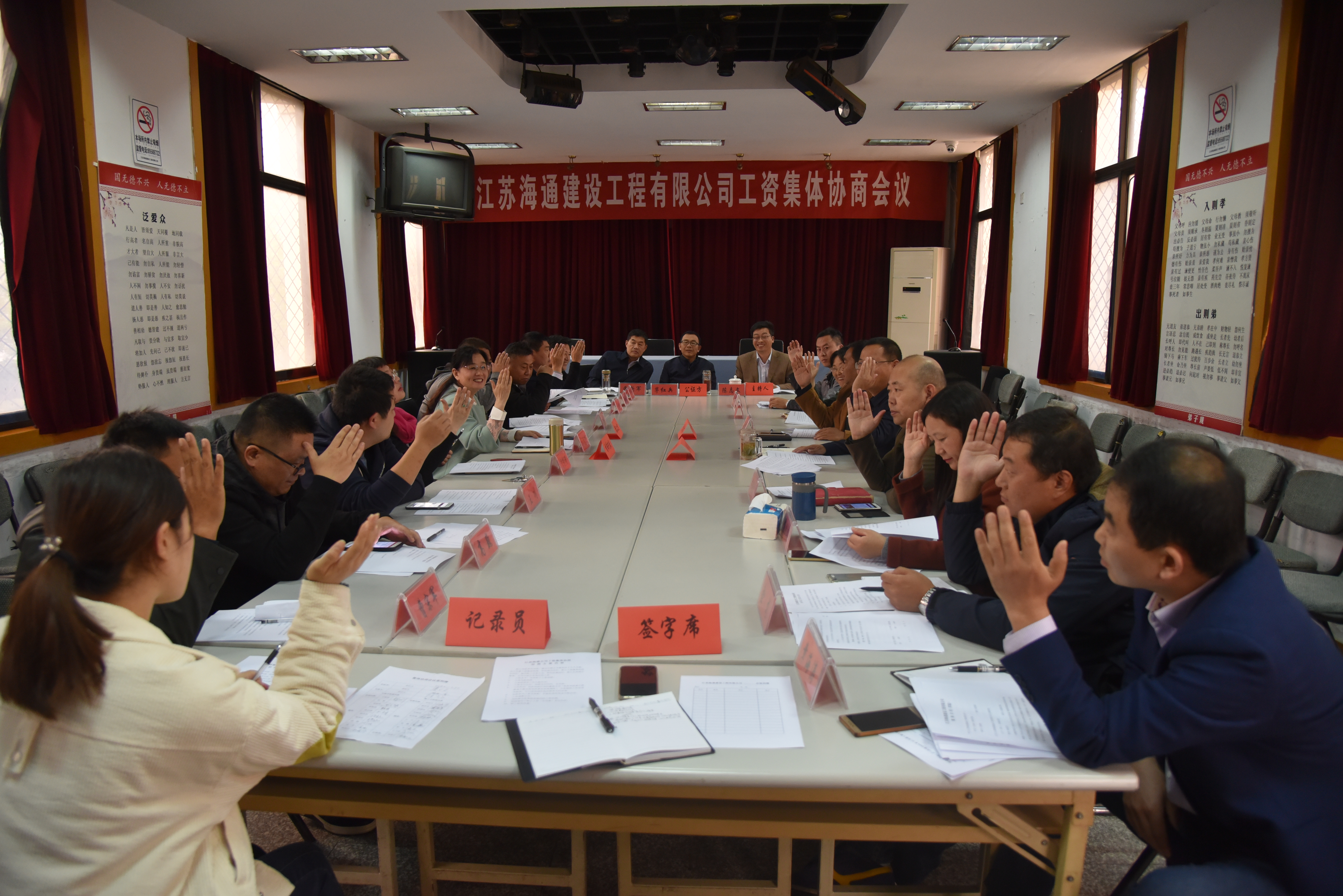 为建立企业和谐稳定的劳动关系,维护职工的合法权益,促进企业发展,11月5日下午,海建公司在多功能厅召开了2018年工资集体协商会议。会议由公司副总经理陈志文主持,董事长茅红兵、纪委书记曹新军作为会议公证方,总经理王梁洲作为行政方首席代表,公司工会副主席刘忠芹作为职工方首席代表,双方代表各9名,共计出席人数21人。